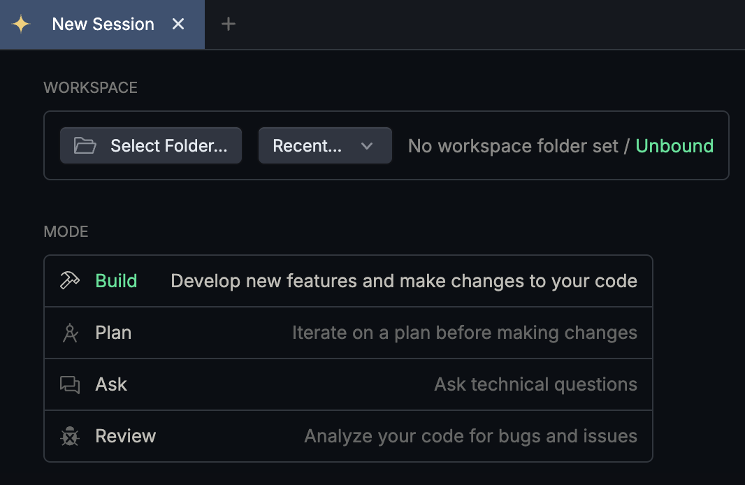 Unbound workspaces are for quick questions, scratch work, or experiments. They let you interact freely with the agent without attaching it to a specific project folder.